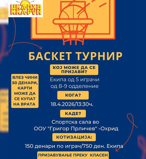 Оваа сабота, на 18.04.2026, со почеток од 13:30ч, во салата на ООУ „Григор Прличев“ – Охрид, една од овогодинешните ПХВ групи која работи на социјален проект со цел помагање на секојдневните потреби на самохрана мајка, организира хуманитарен кошаркарски турнир.