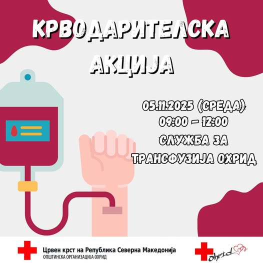 Црвен крст Охрид на ден 05.11.2025 (среда) во соработка и во просториите на Служба за трансфузија Охрид, организира крводарителска акција наменета за вработените на СВР Охрид.