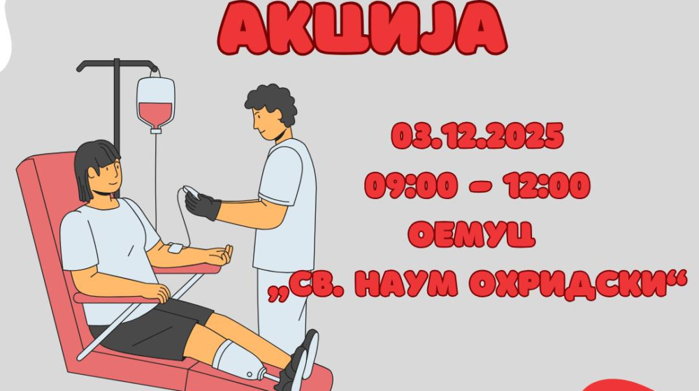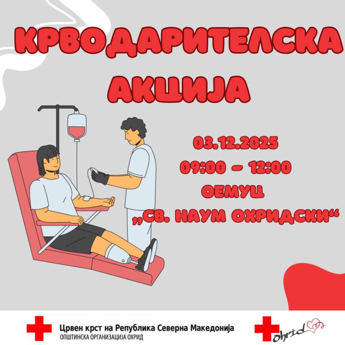Црвен крст Охрид во соработка со Служба за трансфузија Охрид, а во просториите на ОЕМУЦ „Св. Наум Охридски“ – Охрид, организираат крводарителска акција!