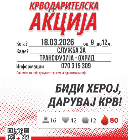 Црвен крст Охрид во соработка со СОСУ „Св. Кирил и Методиј“ – Охрид, а во просториите на Служба за трансфузија – Охрид, организираат крводарителска акција!