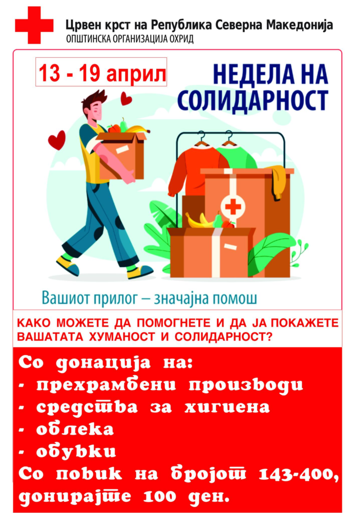 Во рамки на социјално-хуманитарната дејност , а по повод одбележувањето на Неделата на солидарност од 13 до 19 април 2026 година, под мотото „ВАШИОТ ПРИЛОГ – ЗНАЧАЈНА ПОМОШ“, Црвен крст Охрид организира хуманитарна собирна акција.