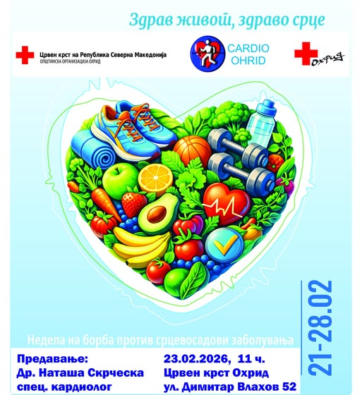 Во соработка со Специјализираната болница за превенција, лекување и рехабилитација на кардиоваскуларни заболувања „Св.Стефан“ во Охрид на 23.02.2026 г. (понеделник) со почеток во 11 ч. во просториите на Црвен крст Охрид Д-р Наташа Скрческа, специјалист кардиолог во болницата, ќе одржи предавање за ризик факторите, превенција, третман и лекување на болестите на срцето и крвните садови.