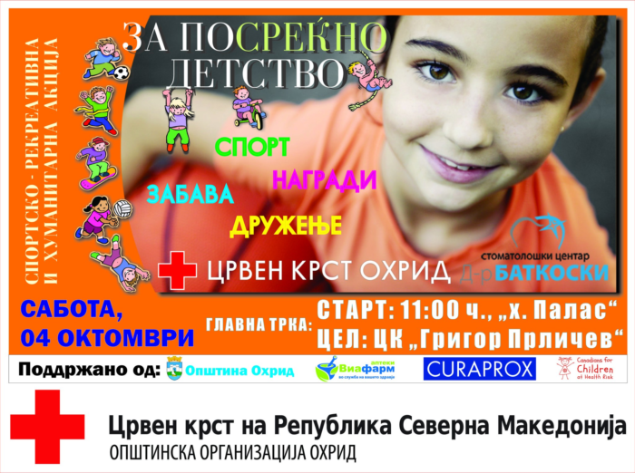 Црвен крст Охрид со големо задоволство ја најавува традиционалната хуманитарна и спортско-рекреативна акција „ЗА ПОСРЕЌНО ДЕТСТВО“ која ќе се реализира во сабота, на 4 октомври 2025 г. Овој настан има широко општествено значење и ќе започне во 11 ч. со „главна трка“ на младите чиј старт ќе биде од Кеј Македонија-пред х. Палас, а цел на Кеј Македонија-пред Центар за култура „Григор Прличев“, каде ќе продолжат спортските, културно забавни и здравствено – едукативни содржини проследени со голем број награди.