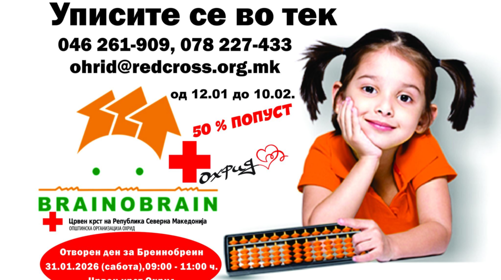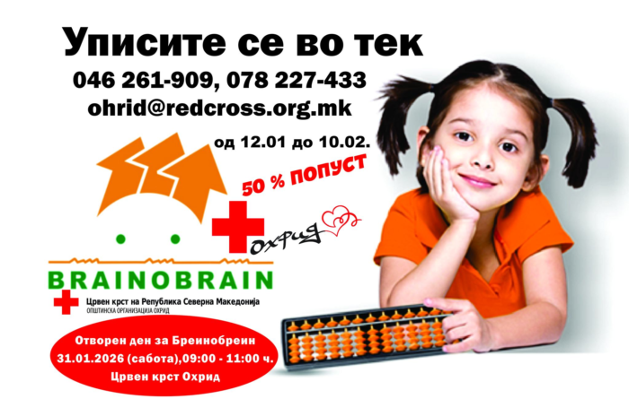 Центарот за развивање на животни вештини БРЕИНОБРЕИН-Црвен крст Охрид започнува со зимските уписи на нови деца од 4-14 годишна возраст, заинтересирани да ја следат интернационалната Бреинобреин едукативна програма преку која ќе имаат можност да ги стекнуваат, развиваат и потврдуваат своите способности: концентрација, меморија, нумерички и вербални вештини, способности за учење, креативност и имагинација, лидерство, самодоверба, визуелизација, решавање на проблеми.