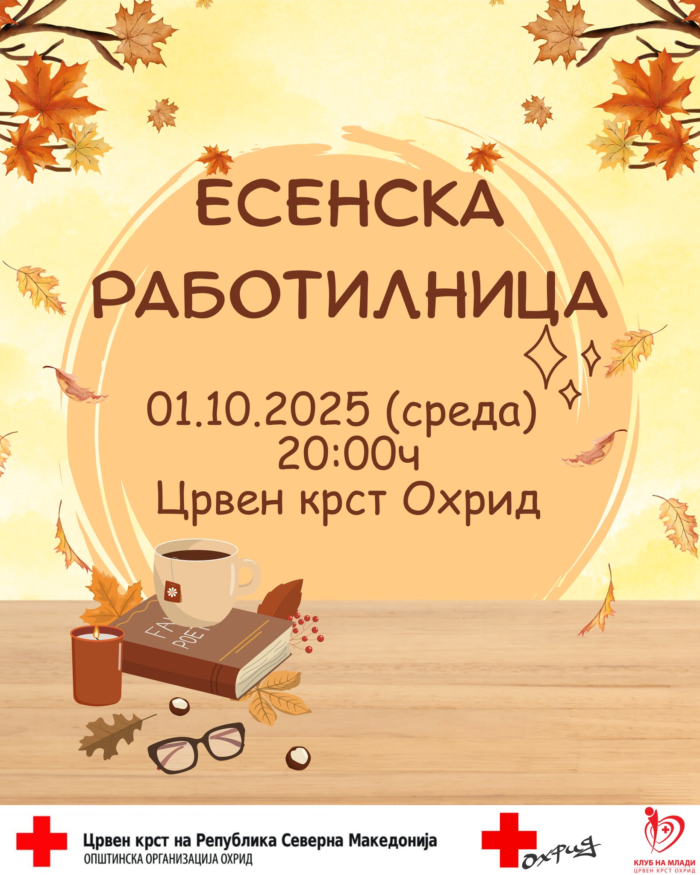 Како прва од многуте активности, утре (1.10.2025), Клубот на млади во просториите на Црвен крст Охрид, со почеток од 20:00ч организира ЕСЕНСКА РАБОТИЛНИЦА.