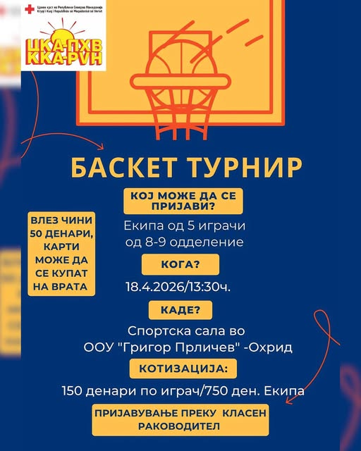 Оваа сабота, на 18.04.2026, со почеток од 13:30ч, во салата на ООУ „Григор Прличев“ – Охрид, една од овогодинешните ПХВ групи која работи на социјален проект со цел помагање на секојдневните потреби на самохрана мајка, организира хуманитарен кошаркарски турнир.