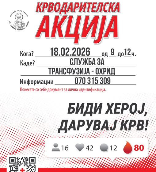 Црвен крст Охрид во соработка со ОСУ „Св. Климент Охридски“ – Охрид, а во просториите на Служба за трансфузија – Охрид, организираат крводарителска акција!