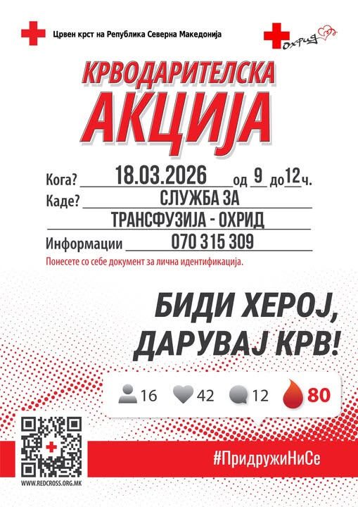 Црвен крст Охрид во соработка со СОСУ „Св. Кирил и Методиј“ – Охрид, а во просториите на Служба за трансфузија – Охрид, организираат крводарителска акција!