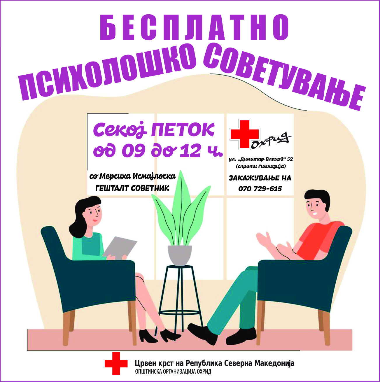 Охриѓани од денес имаат можност за бесплатно психолошко советување во рамки на здравствено-превентивни активности на Црвен крст Охрид, а преку воспоставената соработка со Анима-Центарот за личен развој, едукација и психотерапија. За оваа услуга претходно треба да се закаже термин, а советувањето се одвива во просториите на Црвен крст Охрид секој петок од 9 до 12 часот.