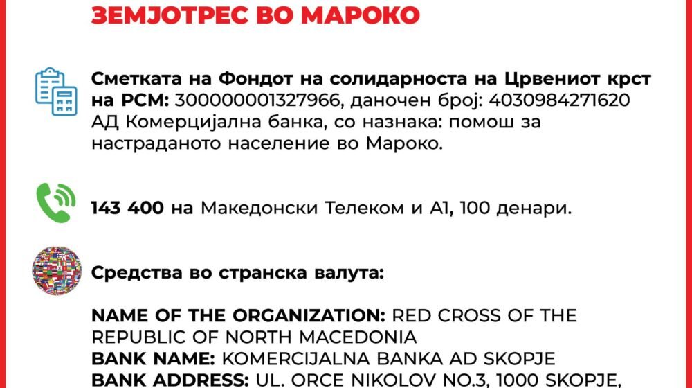 септември 13, 2023ПОМОШ ЗА НАСТРАДАНОТО НАСЕЛЕНИЕ ПОГОДЕНО ОД КАТАСТРОФАЛНИОТ ЗЕМЈОТРЕС ВО МАРОКО < врати се назад