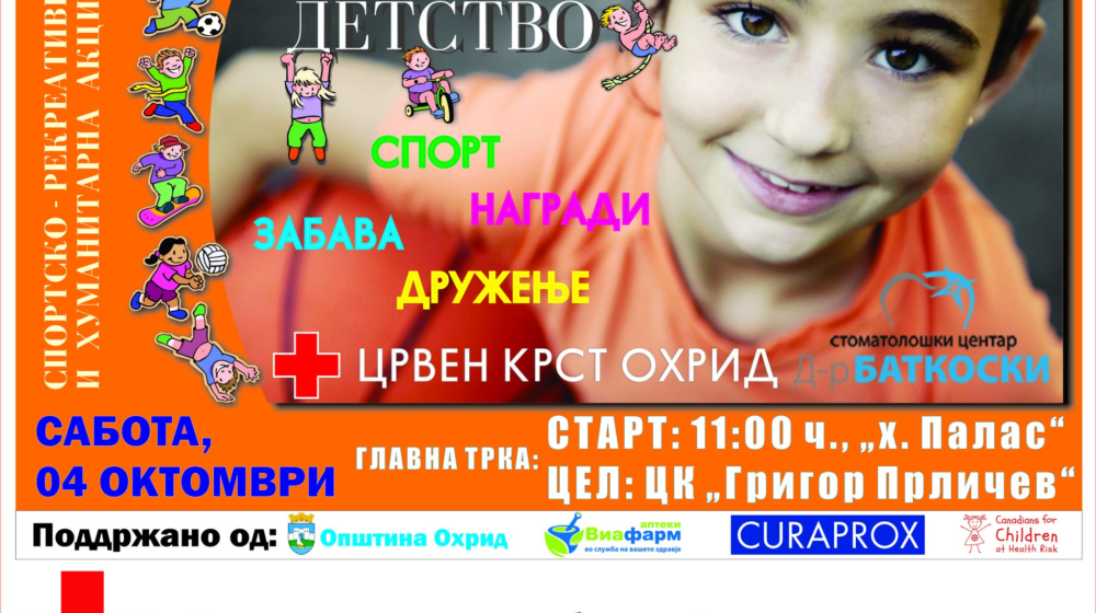 Црвен крст Охрид со големо задоволство ја најавува традиционалната хуманитарна и спортско-рекреативна акција „ЗА ПОСРЕЌНО ДЕТСТВО“ која ќе се реализира во сабота, на 4 октомври 2025 г. Овој настан има широко општествено значење и ќе започне во 11 ч. со „главна трка“ на младите чиј старт ќе биде од Кеј Македонија-пред х. Палас, а цел на Кеј Македонија-пред Центар за култура „Григор Прличев“, каде ќе продолжат спортските, културно забавни и здравствено – едукативни содржини проследени со голем број награди.